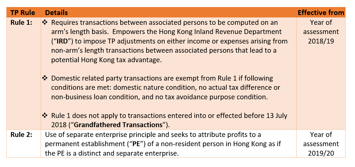 Hong Kong has formally implemented the Transfer Pricing (“TP”) regulatory regime with effect from the year of assessment 2018/19. The TP regime codifies the arm’s length principle of TP into the Inland Revenue Ordinance through the following TP Rules and documentation requirements.