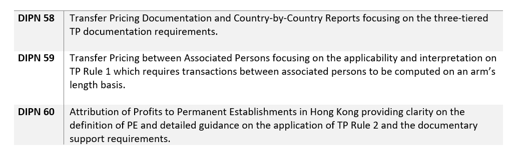 The IRD has issued following DIPNs on 19 July 2019 setting out its interpretation and guidance on the relevant TP rules and requirements as well as the latest international standards relating to transfer pricing: