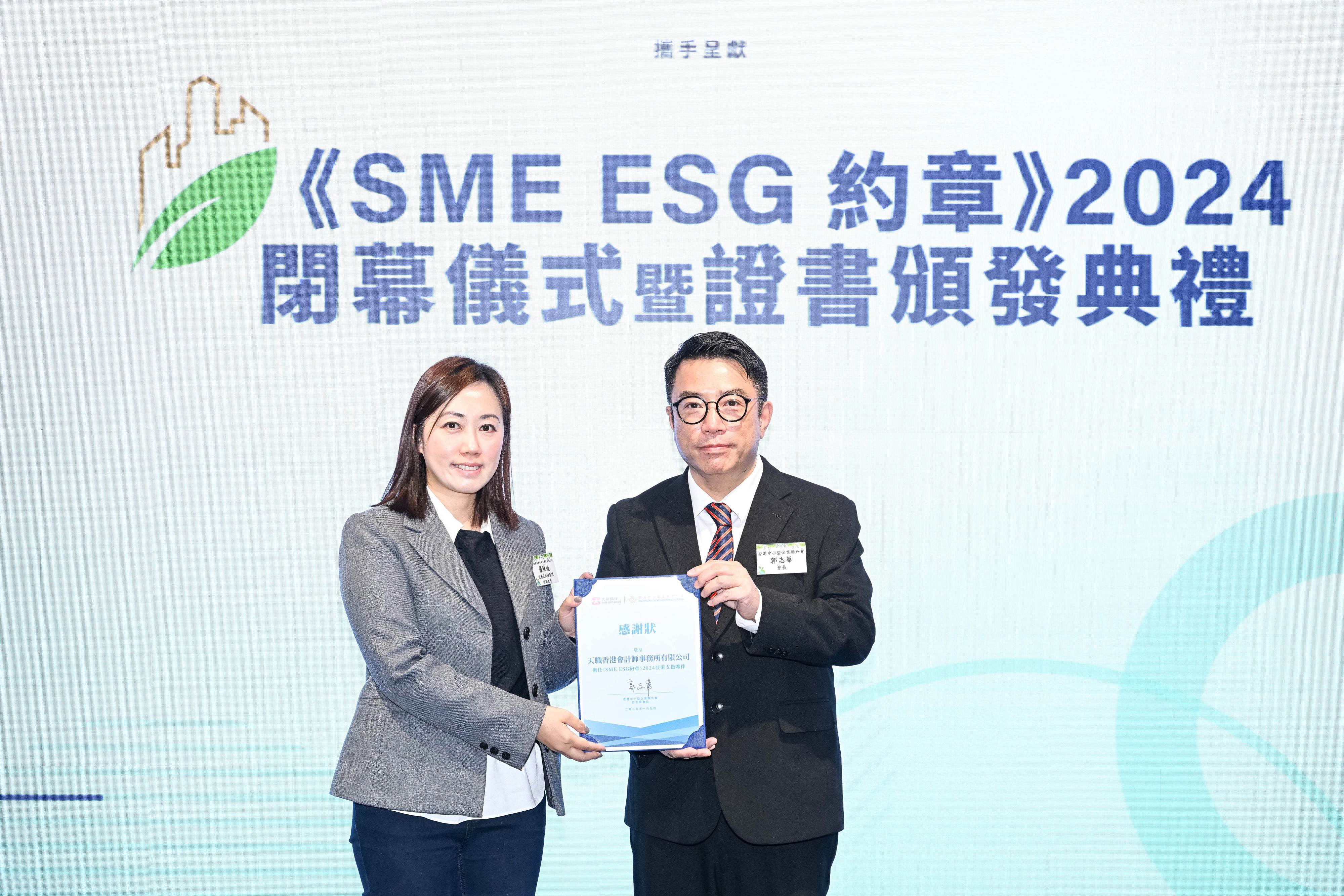 是次活動吸引了35家中小企參與,其中26家獲得了免費的獨立評估和認證。天職香港的盧俊琪女士(董事 - ESG及風險管理咨詢)亦為獲獎企業頒發證書。